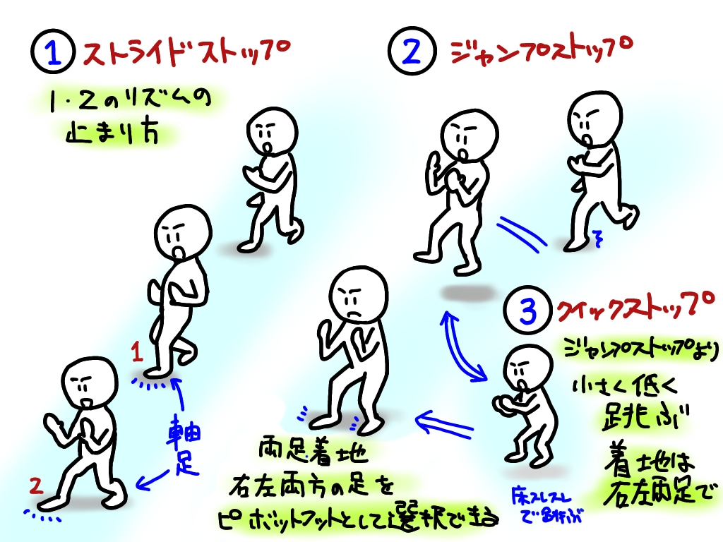 - ジャンプストップ(止まる前に軽くジャンプをして両足で止まる動作)